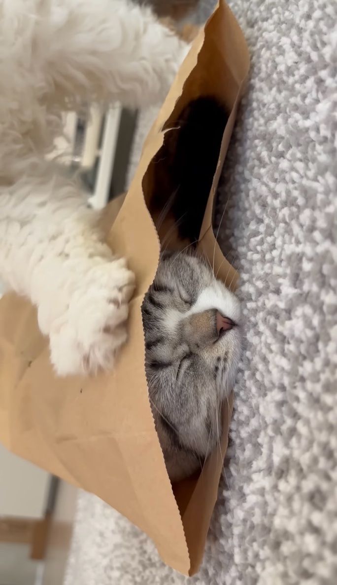 ネコが遊んでいる紙袋の中に入り込んでいたきょうだいネコ。 その様子は、こちらの動画からご覧いただけます。