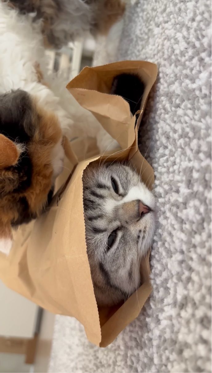その紙袋の中を覗くと・・・、なんときょうだいネコが隠れていました! 紙袋を引っかいて遊んでいたネコは、先ほどからこの子頭を袋越しにガリガリしていたようです。