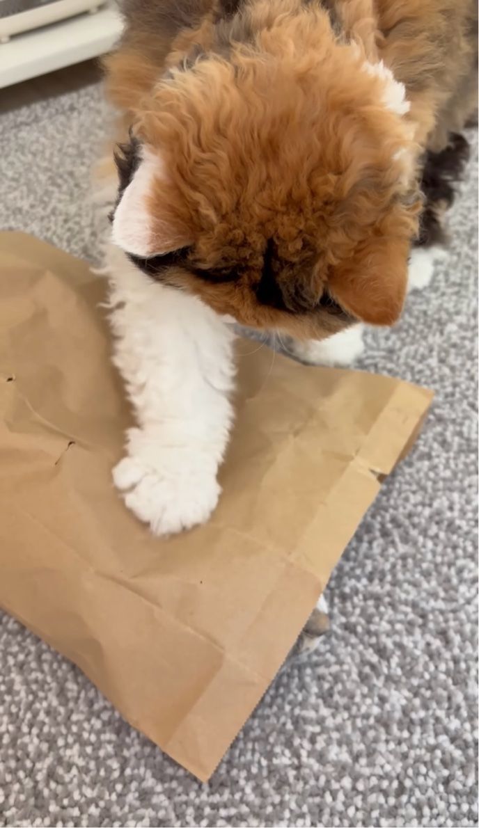 紙袋をオモチャにして遊んでいるネコ。 表面を爪で引っかいてガサガサと音を立てるのにハマっているようです。