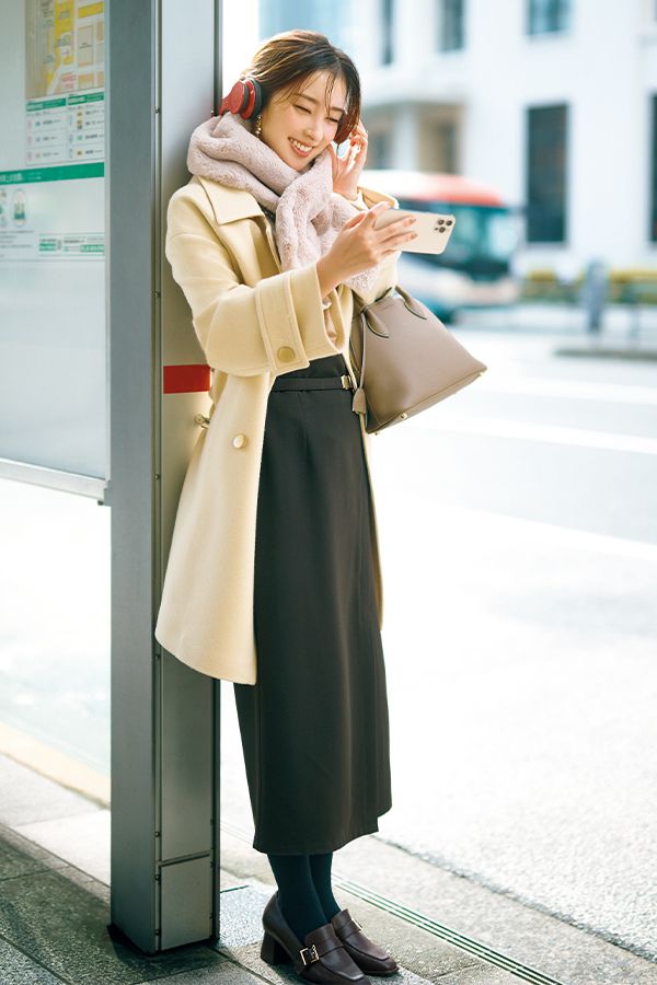 深い色みだけでなくタイトなシルエットにも大人っぽさが宿るペンシルスカートを、ライトイエローのコートを合わせてフレッシュな着こなしに。バッグも色を寄せて、まとまりよく仕上げて。