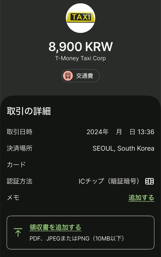 友人と渡航した韓国では、5万円換金しクレジットカードと同じように使用。タクシーの支払いでタッチ決済もOK。このように利用記録も出るので、友人と割り勘するときにも便利です。クレジットカードと違い、為替レートと近い金額で使用できるので、旅行先の支払いをWiseに寄せるだけで安く感じることも。