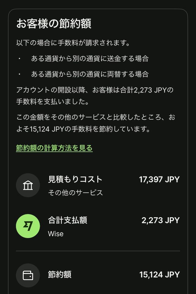 さらに、使い始めて2カ国ほど使いましたが、wiseを見るとこんな表記も。なんと15,000円ほど得をしているようです。そして使用して気づいたのが、海外通貨建てのオンラインショッピングでもwiseを使うとお安く済むこと! 海外通貨建てのクレジットカードの支払いで手数料がかかるからこそ、日本にいても使うと便利な存在です。