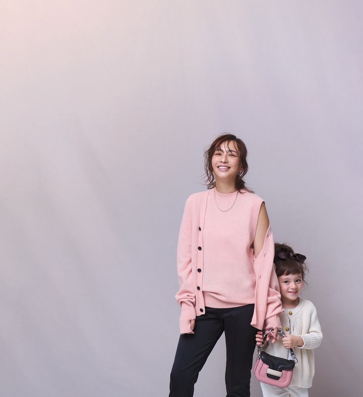 キレイ色のアンサンブルで上品に。カーディガンはゆったり長め丈なので、腰回りをカバーでき、移動や家事で立ったり座ったりが多い年末年始に重宝。カーディガンとニットはハイク、パンツはプレインピープルのもの。