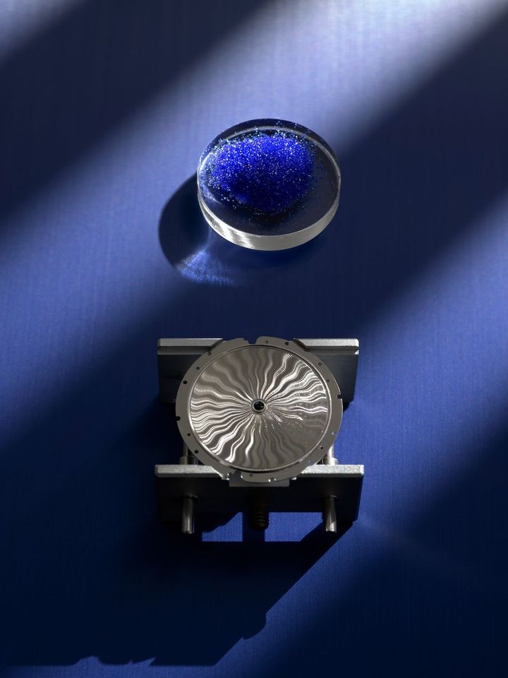 本モデルのダイアルには、最高峰の職人によるギョーシェ彫りの装飾、そして彫金とエナメルを組み合わせる「シャンルベ」と、ギョーシェ彫りの上から透明エナメルを施す「フランケ」の2種類の技法によるグラン フー エナメルが施されている。1本のダイアルを製作するために、異なる技を持つ4人の熟練職人が集結して仕上げられた。