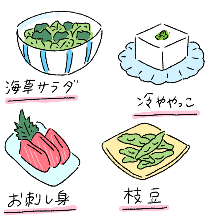 居酒屋の定番メニュー「海草サラダ」「お刺し身」「冷ややっこ」「枝豆」は、お酒に合うだけでなく、アルコールの代謝も助けてくれる優秀なおつまみ。海草類に含まれる水溶性食物繊維には、腸の余分な糖やコレステロールを吸い取って排出してくれる効果があります。また、お刺し身などの魚介類には、肝臓の働きを高めるたんぱく質やタウリン、腸の働きをなめらかにるすオメガ3脂肪酸が豊富。さらに、冷ややっこ、枝豆などに含まれるビタミンB1には糖質を燃焼する効果が期待できます。