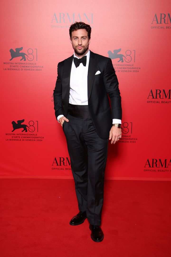 2024年8月のベネチア国際映画祭にてまとったのが、ジョルジオ アルマーニのタキシード。マイクロプリーツのシャツにボウタイ、プリーツの入ったサテンのカマーバンドという、オールドスクールなアイテムをちりばめた装いが、ハリウッドの黄金時代を彷彿させます。