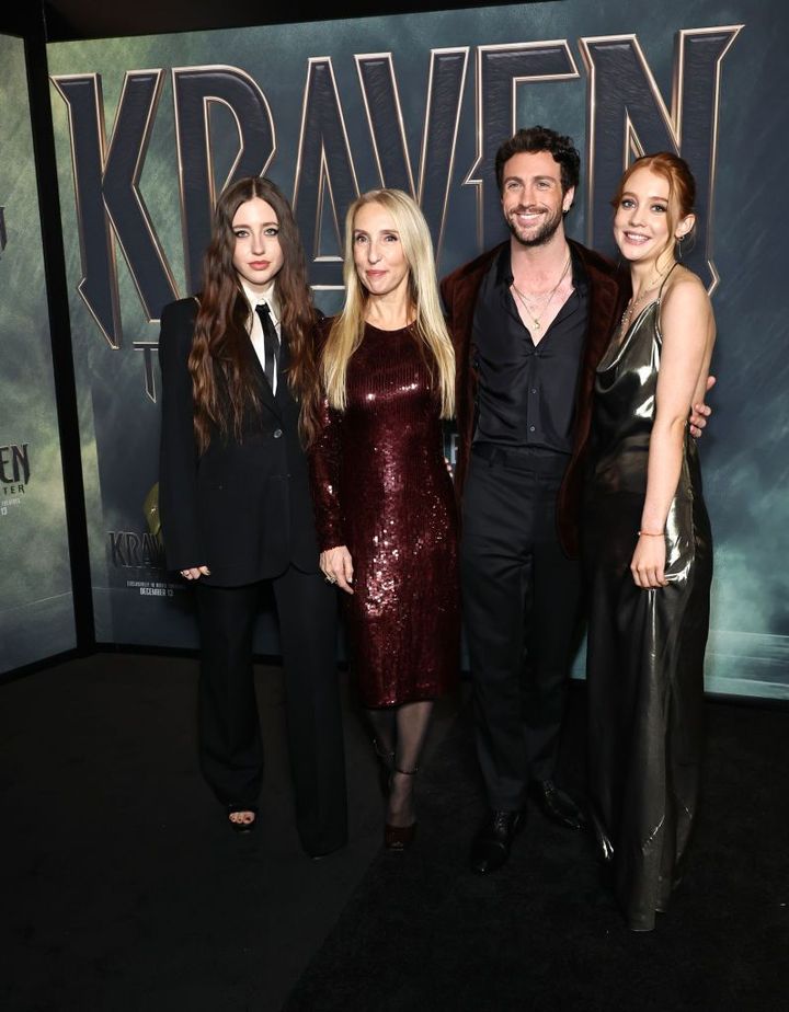 妻・サムの連れ子であるふたりの子どもの継父でもあるアーロン。2012年の結婚を機に、夫婦そろって姓を「テイラー=ジョンソン」に変更しました。写真は2024年12月、現在公開中の主演映画『クレイヴン・ザ・ハンター』のNYプレミアにて。妻のサム、義理の娘のアンジェリカ(左)、ジェシー(右)とともに。