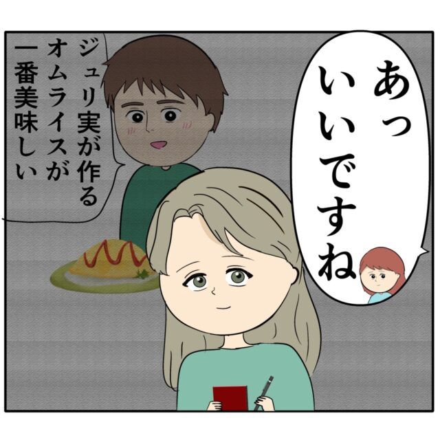 「あっいいですね」と賛同するめいさんの言葉を聞きつつ、ジュリ実さんは「ジュリ実が作るオムライスが一番美味しい」と付き合っていた頃にろみ緒さんに言われた言葉を思い出し優越感に浸っていました。