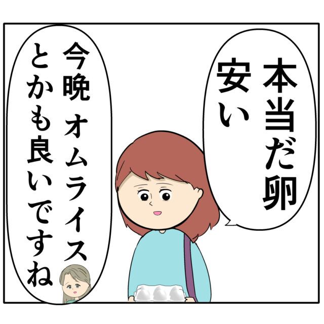 ジュリ実さんから「今日、卵お買い得みたいですよ」と聞いためいさんが卵売り場で「本当だ。卵安い」と手に取ると、「今晩オムライスとかも良いですね」とジュリ実さんが言いました。