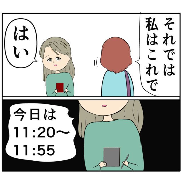 「それでは私はこれで」とめいさんが帰ると、「今日は11:20~11:55」とすかさずメモするジュリ実さん。