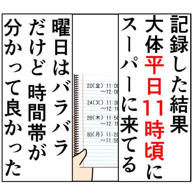 めいさんがいつスーパーに来ているのかを数日間チェックしていたジュリ実さん。記録した結果、曜日はバラバラですが大体平日の11時頃にスーパーに来ていることを把握しました。