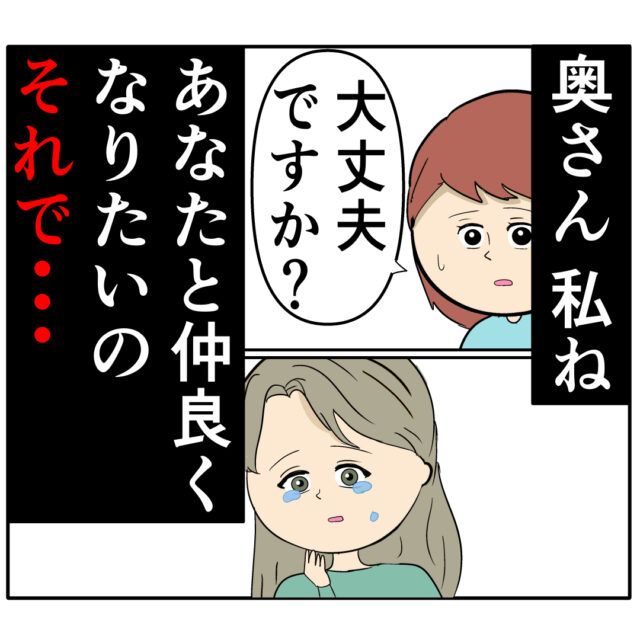 ジュリ実さんが大粒の涙を流していたのです。思わず「大丈夫ですか?」と声をかけるめいさん。ジュリ実さんは涙を流しながら心の中で「奥さん、私ね、あなたと仲良くなりたいの。それで・・・」と何かを企んでいました。