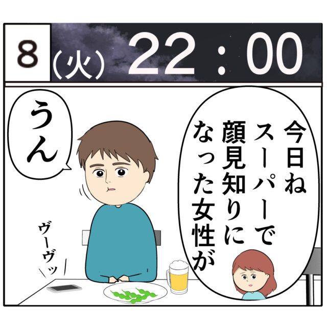 その夜。めいさんが帰宅したろみ緒さんに「今日ね、スーパーで顔見知りになった女性が」と、今日あった出来事を話し始めると、ろみ緒さんのスマホが鳴りました。