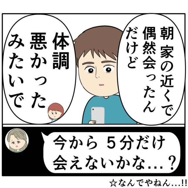 めいさんが「朝、家の近くで偶然会ったんだけど、体調悪かったみたいで」と話すのを聞きながらろみ緒さんがスマホを確認すると、それは「今から5分だけ会えないかな・・・?」というジュリ実さんからのメッセージでした。