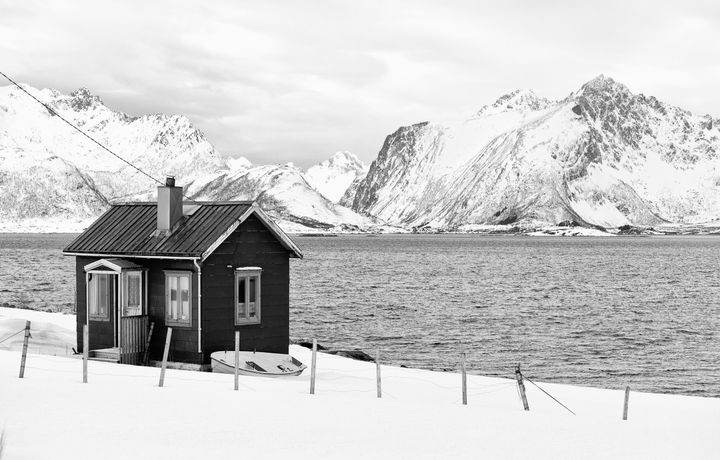 Wooden home (rorbu) in winter on Lofoten Islands, Norway