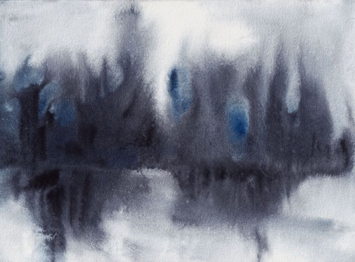 Abstract loose modern watercolor landscape art. Blue and white grey sky, indigo landscape. Impressionist illustration of winter or dark depressive state of mind
