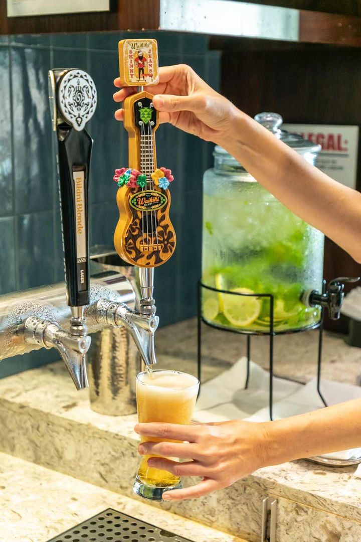 サーバーから自分で入れるハワイの地ビール。泡の調整に四苦八苦するのも楽しい。ワインもありますよ。
