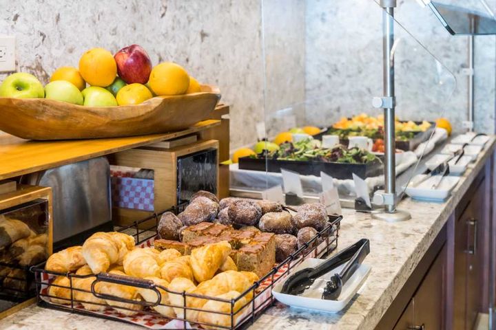 サラダ、フルーツ、パンやシリアル、ヨーグルト、ハム、チーズなど種類豊富。