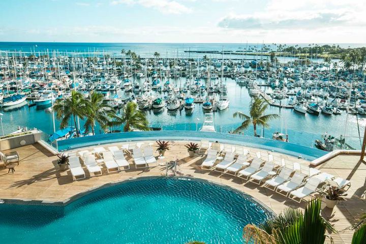 2017年の改装で生まれ変わった「プリンス ワイキキ」のプールエリアは、まさに極上のリゾートタイムを楽しめる場所。特にハーバーに面したインフィニティプールは、ハワイの空と海がひとつに溶け込むような絶景が広がり、心が解放されます。