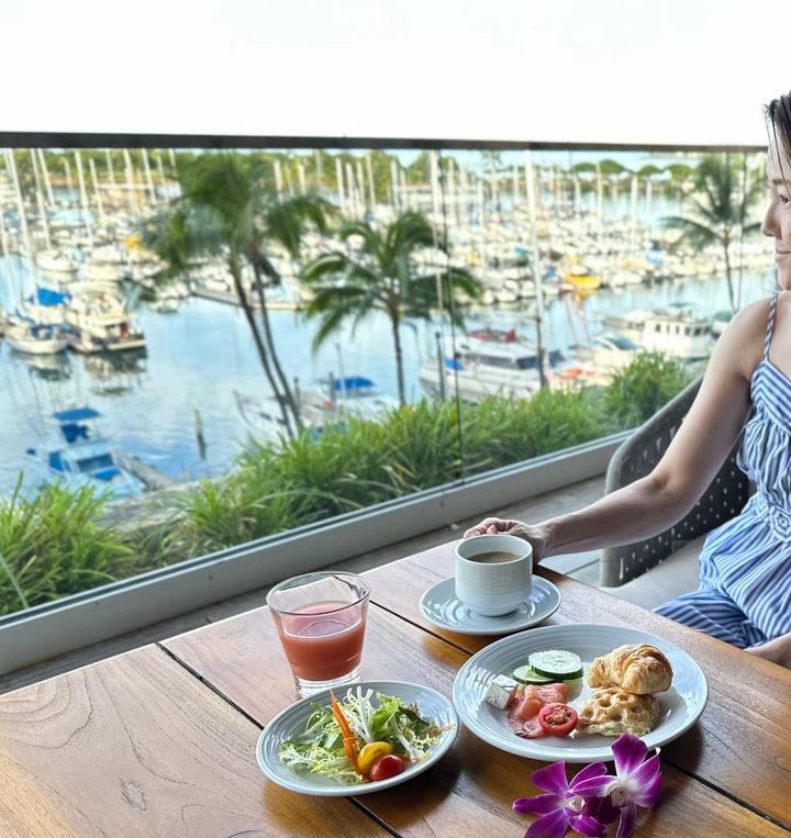 「これよー!これこれ!」と思わず声が出る客室からの絶景。ヨットハーバーの先に広がる太平洋、右手にはサンセット名所のマジックアイランド。