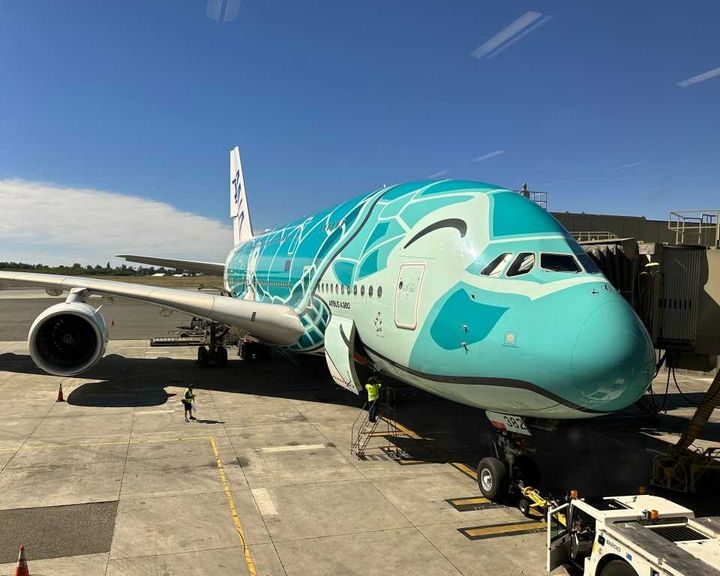 世界最大の旅客機エアバスA380型機で。成田空港から1日2便運航していて、総2階建ての巨大な機体と、そこに描かれたウミガメのペイントが特徴です。そもそも、あまり耳馴染みのない「ホヌ」という名前。これは、ハワイで“幸福を運ぶ神聖な生き物”とされている「ウミガメ」を意味するハワイ語で、この機体に乗ってハワイに旅する人に幸運が訪れるように、という願いが込められているそう。