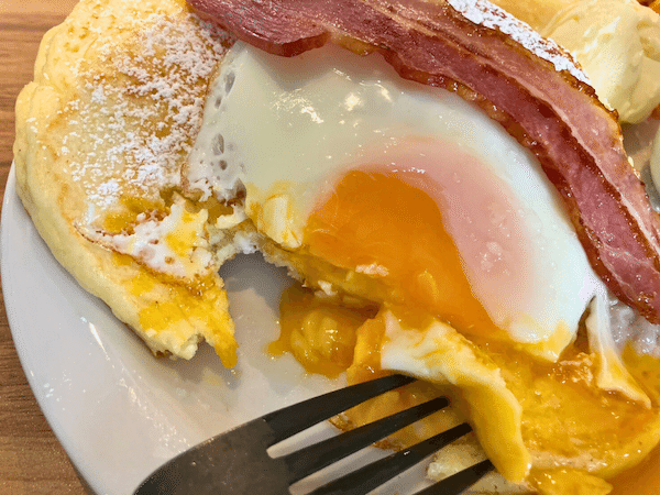パンケーキは大きめの2枚に、目玉焼きとベーコンが乗ったスタイル。軽食というより、しっかりとした朝食として楽しめるボリュームです。