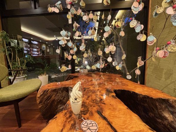 木が気に入り。この後運転するので、スパークリングワインのグラスに函館牛乳ソフトクリームで雰囲気を味わいました♪