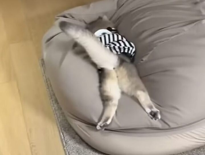 勢いよく、クッションに飛び込んでポフン♡ 楽しい遊びにハマる猫さん