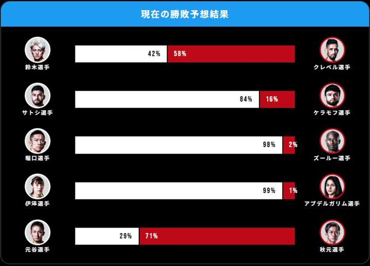 ほかにも、バンタム級王座次期挑戦者決定戦の元谷友貴が29%に対し、秋元強真は71%で優勢、伊澤星花の試合では、伊澤が99%の優勢に対し、ルシア・アプデルガリムが1%という圧倒的な結果となった。