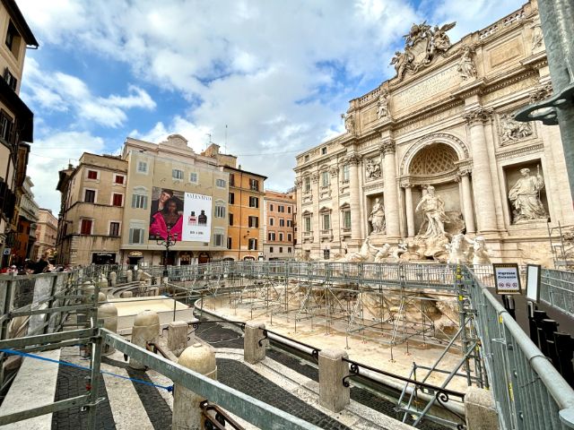 バロック時代に建造された巨大な人口和泉「トレビの泉」。泉に背を向けてコインを投げると願いが叶うとされていることで有名です。筆者が訪れたとき(2024年11月)はメンテナンス工事中で、残念ながら噴水内の水は抜かれていました。
