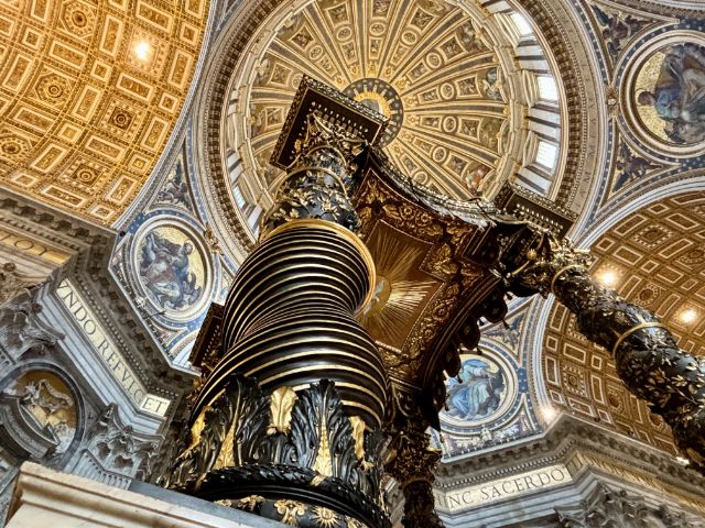 印象的な螺旋階段を通り、隣接するサン・ピエトロ大聖堂は、ミケランジェロが設計した素晴らしい建物で、聖堂内部のバルダッキーノと言われる大天蓋。四本のブロンズのねじれた柱が彫刻をまとってそびえています。 寺院を囲むベルニーニ設計の円形広場は、キリスト教の愛を象徴する場所として知られています。