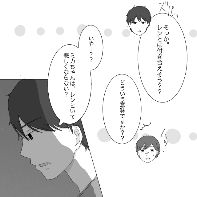 アツシさんはさらに「そっか。レンとは付き合えそう??」と突っ込んで聞いてくるので、私はちょっとムッとして「どういう意味ですか??」と聞き返しました。すると「いや・・・??ミカちゃんは、レンといて悲しくならない?」とアツシさんは視線を落としながら聞いてきたのです。