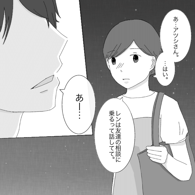 声をかけてくれたのは彼の友達のアツシさんでした。「あ・・・アツシさん。・・・はい。レンは友達の相談に乗るって話してて」と一人で帰る理由を話しました。するとアツシさんは「あー・・・」と少しためらった後、
