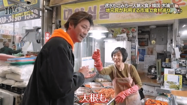 そこで速水は、約220店舗が軒を連ねる木浦の市場へ。さまざまな地元食材からレシピのヒントを得ていった彼は、とある店の女性従業員からキムチの試食を勧められた。とってもフレンドリーな女性従業員は、キムチを手渡しではなく、速水の口に“あーん”で直接イン! 照れながらキムチを食べた速水は、そのおいしさにビックリした。