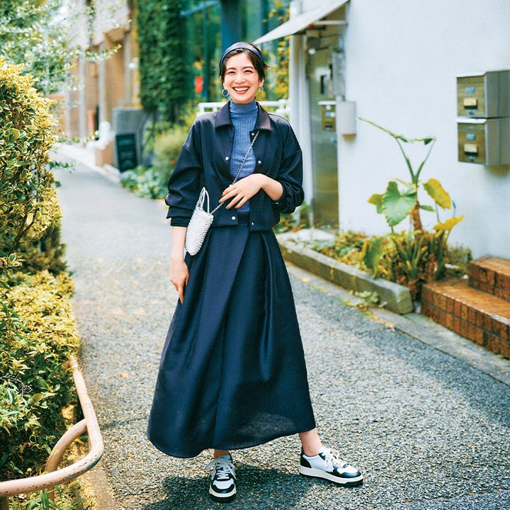 ネイビーで揃えたセットアップ風に クラシックな最旬スニで垢抜ける。 帰省にちょうどいいキレイめカジュアル