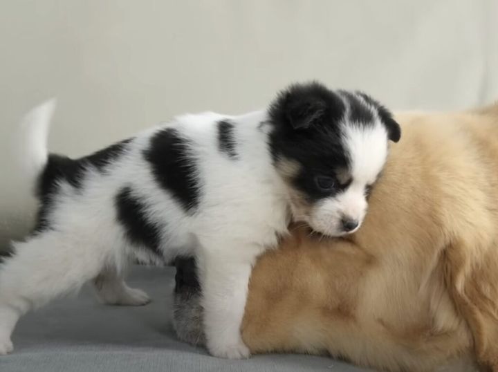大好きなゴールデンレトリバーに、ぴったりくっついて離れない子犬さん。