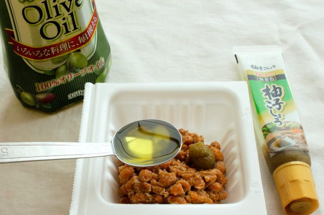 オリーブオイルとゆずごしょうで納豆の匂いが和らぐ♪簡単味変でイイ!