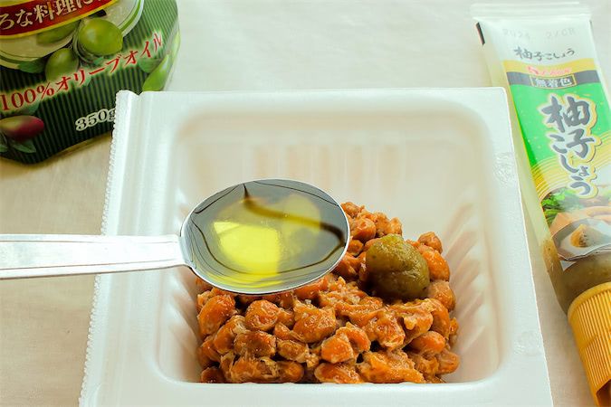 1. 納豆にオリーブオイルとゆずごしょうを加えます。