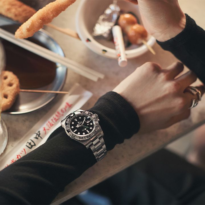 時計「GMTマスター Ⅱ」[オイスタースチール、40mm]¥1,540,000(ロレックス/日本ロレックス)タートルニット¥16,500(スリードッツ/スリードッツ表参道店)ビスチェ¥23,000(シーニュ)タックパンツ¥70,400(ハウス オブ ダグマー/エリオポール代官山)ジャケット¥74,800(ホリデイ/ホリデイ/フラッグシップサロン オフィス)ピアス¥22,000リング¥44,000(ともにブランイリス/ブランイリス トーキョー)バッグ¥165,000(J&M デヴィッドソン/J&M デヴィッドソン カスタマーセンター)
