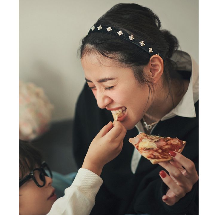 なかなか来ないエレベーターを待つ夕刻のマンションエントランス。息子と同じクラスの女の子とお母さんがやってきた。すぐに子ども同士が遊びだし、慌てて自己紹介。オシャレで可愛いママって前から気になってた人、同じマンションなんだ…!え、何話そう!?ってモジモジしてたら子どもたちからの熱烈な“ごはん一緒に食べたい!”コールが。お互いワンオペみたいだし、思い切って誘ってみることに。「明日お休みなら、よかったらうちでウーバーします?」そんなわけで急遽ピザパーティ開宴。サラダだけ作るね〜と部屋着に着替えた時に手に取ったのは、ヘアバンド感覚で使えて自然に盛れるカチューシャ。ヘッドアクセ可愛いですね!うちの間取り、反転バージョンです〜なんて無難な会話も、お酒が進むにつれて意気投合しプライベートトークが加速。夫の愚痴が出かかったところでちょうど騒ぎ出したキッズたちを映画とお菓子で鎮める。ときに信念を曲げてでも守りたい大人同士の会話という深呼吸と子どもたちの笑顔がここにはある…!ぜひ定例化しようって次の約束もしたことだし、リビングでごはんできるローテーブル、明日ニトリに探しに行こう。金曜の夜は特に、母になって失ったことを数えがちだけど。子どもと一緒だからこそ過ごせる時間を楽しみに、また来週も頑張ろ。そんなふうに思えるママの華金も悪くないよね。