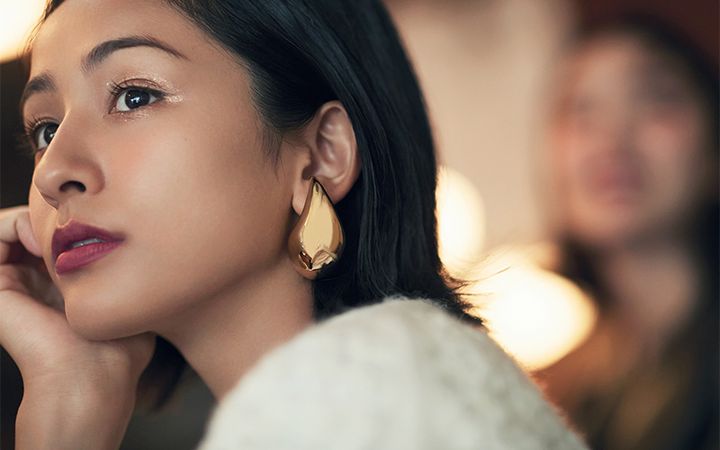 暗めの照明を拾い、バストアップ映えする大ぶりジュエリー。それどこの?なんてカンバセーションツールとしても活躍するはず。11月28日にオープンするボッテガ・ヴェネタ麻布台ヒルズで先行発売。