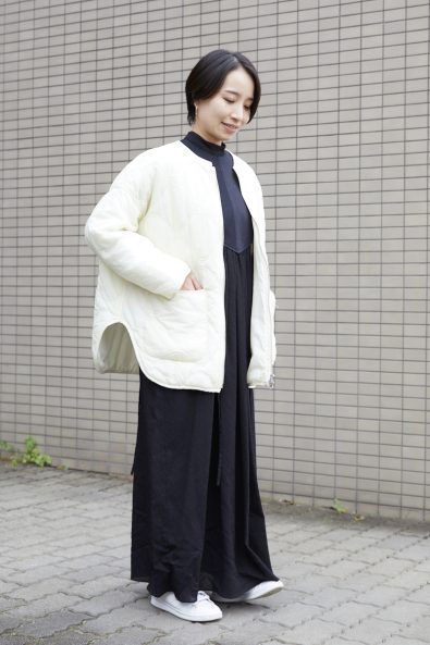 シックなワンピースを、軽めのダウンやスニーカーでカジュアルダウン。重たくなりすぎず、軽やかな装いに仕上げています。