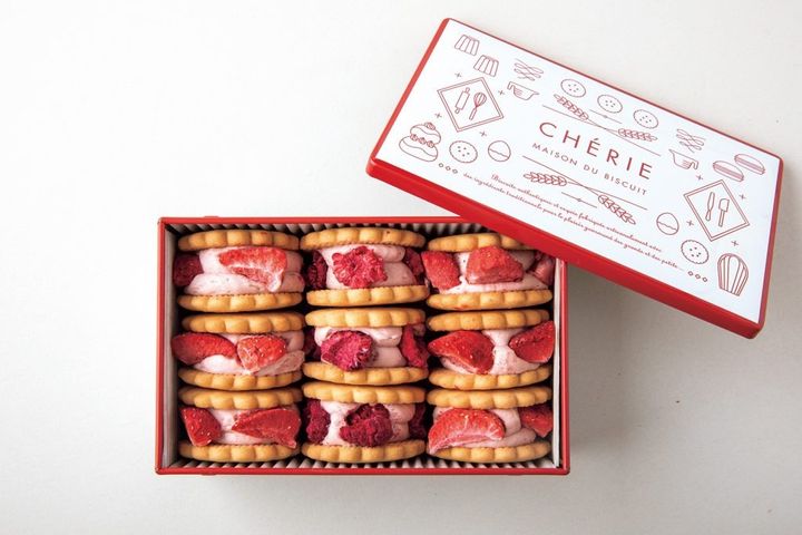 菓子研究家の小林かなえさんが京都御所の南に構えたパティスリーで、垂涎の的となる一品は缶を開けるや心奪われる愛らしさ!サクッと焼き上げたビスキュイに、国産発酵バターと最高級クーベルチュール、ルビーチョコを使ったクリーム、フリーズドライのいちごとフランボワーズをサンド。バターの香り、軽やかな口当たり、甘酸っぱいベリーがたまりません。フレーバーはラムレーズンやチェリー、マロングラッセ、さらに季節限定品も登場します。