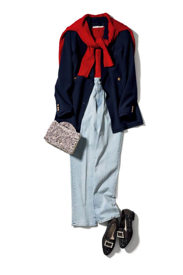 ジャケットとカーデのレイヤードが新鮮。ハンサムなマリンルックに、ふわふわのファーバッグで女らしさを加えて。