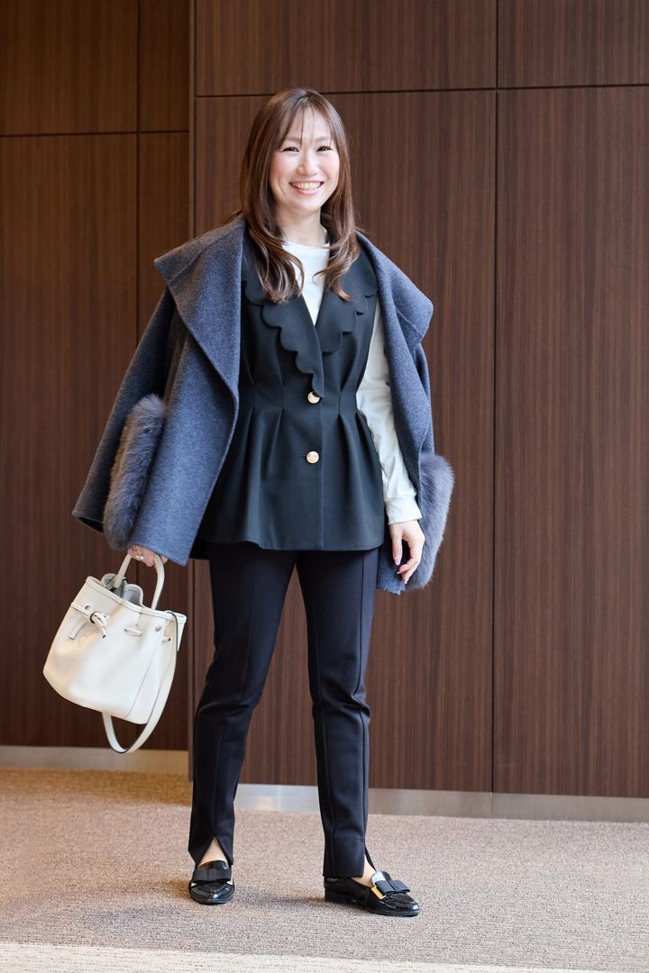 「インスタで見て気になっていたアウターは、首元とフロントのデザインが私の骨格に合いそうと思って購入。北海道出身で寒さには慣れているのと、車移動が多いのでコートは動きやすいショート丈を選ぶことが多いです。今回は新幹線移動での受注会参戦でしたが、車内で脱いだときも邪魔にならず、コンパクトで便利でした。ランチや学校行事などにも着て行ける万能アウターです」石川菜生さん/40歳・162㎝(11歳と8歳と5歳の女の子ママ)