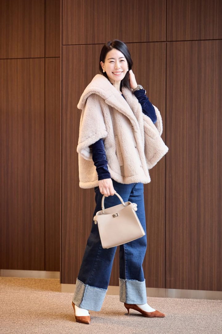「冬の受注会は試着のために脱いでも持ち歩きやすいショート丈が鉄板。午後ポップアップに行く予定のシーマリーのお気に入りアイテムを着てきました。このケープはひとりで出かけるときの気分も上げてくれます」井川久美子さん/37歳・155㎝(3歳の男の子ママ)