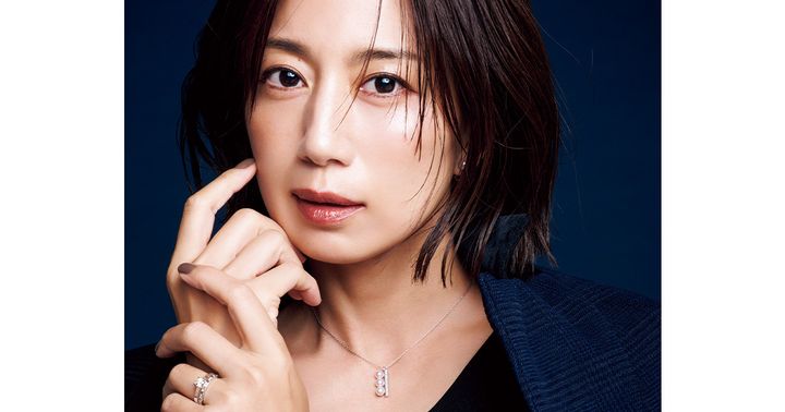 きゅっとした縦の配列がどんなトップスとも好相性。ラフにもフォーマルにも幅広く使える。「バランス プラス ネオ ダイヤモンド パヴェ」ペンダント〈WG×あこや真珠×DIA〉¥660,000パール イヤリング〈WG×あこや真珠〉¥88,000リング「ピアノ」[上]〈SG×DIA〉¥1,057,100[下]〈PT×DIA〉¥497,200(すべてTASAKI) ジャケット¥30,800カットソー¥10,780(ともにカデュネ/カデュネ プレスルーム)