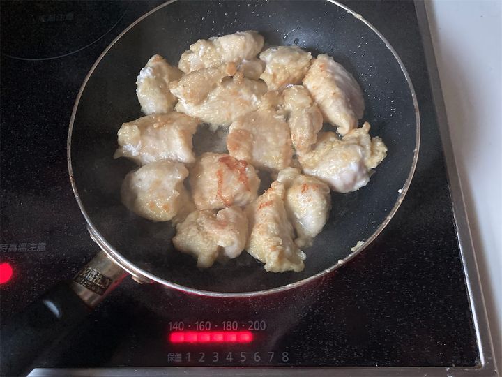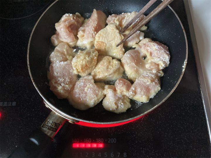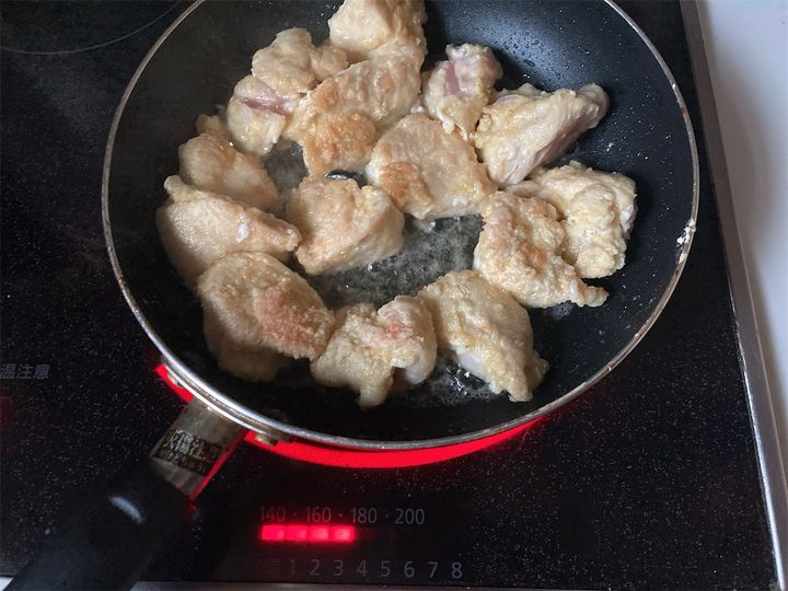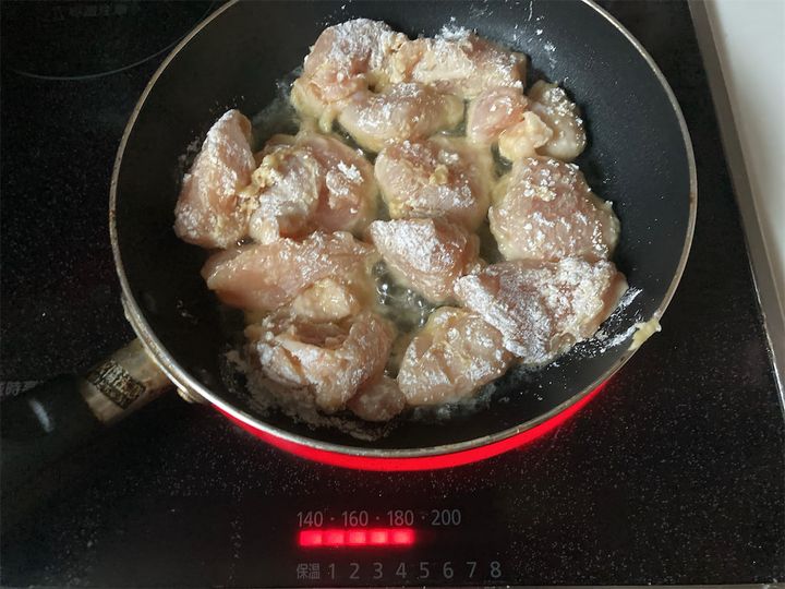 下準備をしておいた鶏肉に薄力粉をまぶし、焼いていきます。
