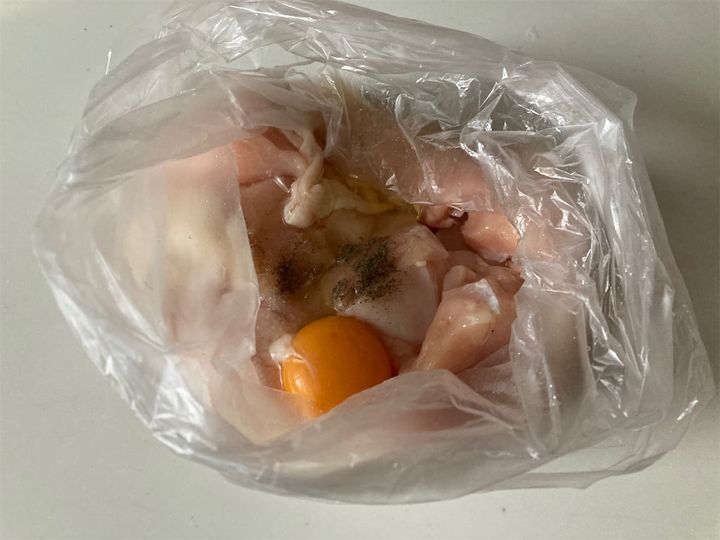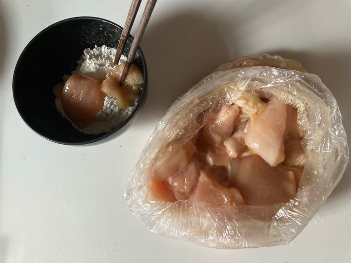鶏むね肉は、ひと口大のそぎ切りにしてポリ袋に入れます。