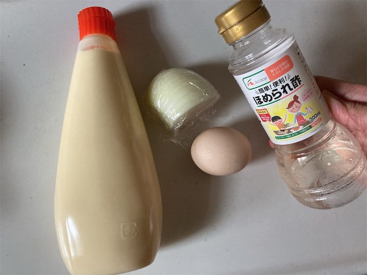 マヨネーズ(適量)、玉ねぎ(1/4個)、ゆで卵(1個)、調味酢(適量)を準備して…